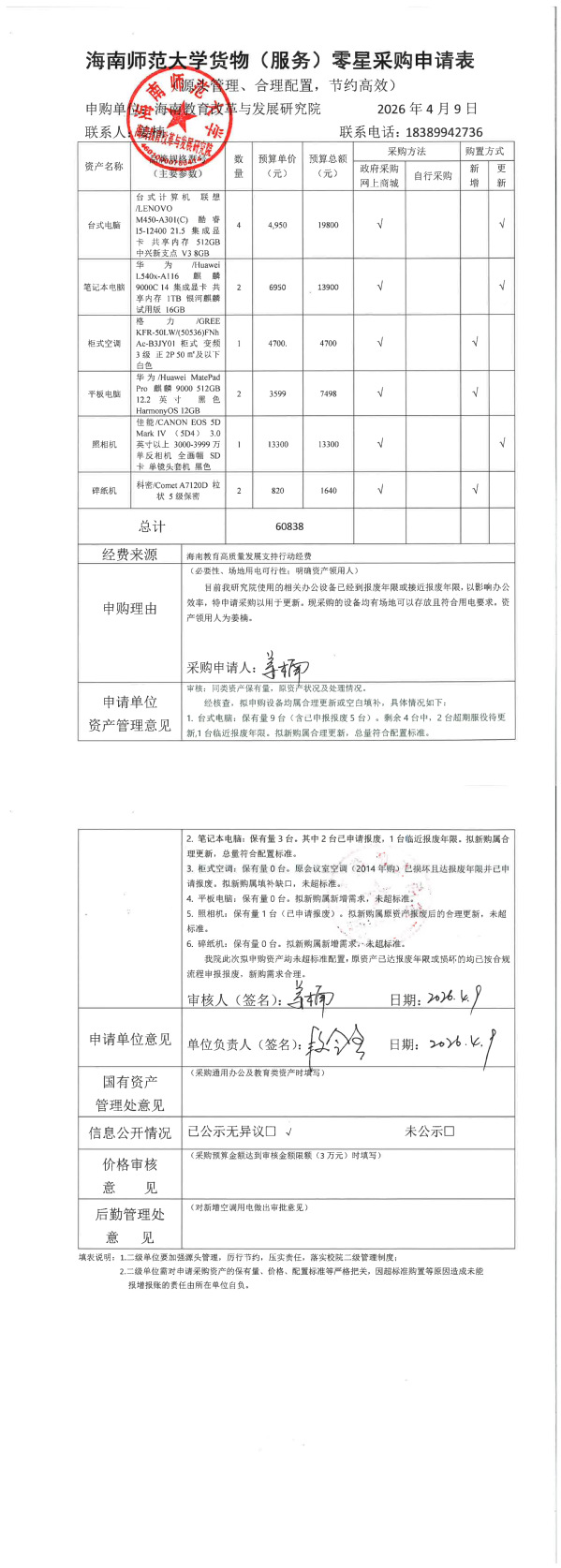 根据学校相关采购管理规定,我院拟采购一批办公设备,现将具体购置明细予以公示(详见附件)。公示期为4月14日至4月16日。如对本次采购物品有异议,请在公示期内拨打电话:0898-65861718。